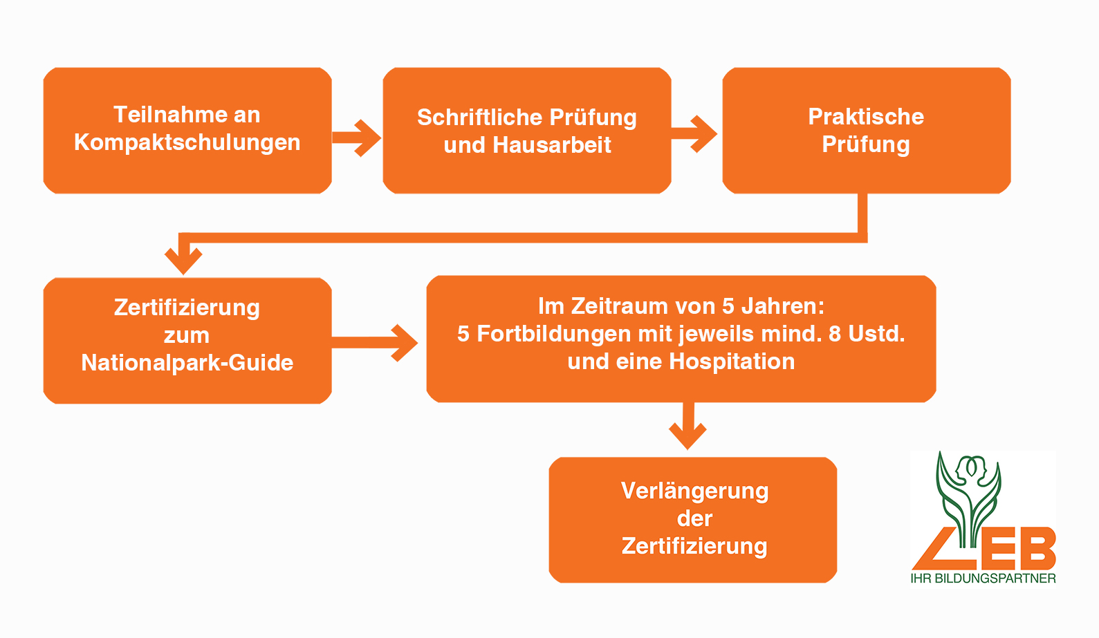 Die Zertifizierung zum/zur Nationalpark-Führer:in wird von der Nationalparkverwaltung in Zusammenarbeit mit der Alfred Töpfer Akademie (NNA) und der LEB vorgenommen und ist befristet. Es sind Vereinbarungen zur Einhaltung von Gütekriterien zu unterzeichnen. Viele verschiedene Institutionen und Referent:innen sind eingebunden, wodurch die Teilnehmer:innen vielfältige Impulse erhalten.